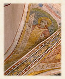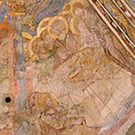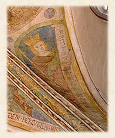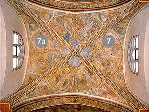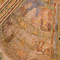 Letztere Szene ist nicht eindeutig zu bestimmen. Es ist anzunehmen, es handele sich um eines der drei im Buch Esther genannten Mähler; denn kein anderes Mahl scheint typologisch gedeutet worden zu sein. Die Schwierigkeiten ergeben sich aus dem heutigen Zustand des Freskos; nach starker Zerstörung sind die Köpfe der am Tisch sitzenden Gestalten weitgehend rekonstruiert. Keine Beischrift nennt den Anlass des Festes oder die vier Personen - von rechts: ein Mann, der Hut oder Krone trägt und einen Pokal in der Hand hält; neben ihm eine kindhaft kleine, vielleicht weibliche Gestalt, um deren Schulter der rechts sitzende Mann den Arm legt; eine jüngere, bartlose Person, deren Geschlecht nicht zu benennen ist; ganz links ein älterer Bärtiger. Das rechte Paar ist durch einen Vorhang ausgezeichnet, in dem Mann wird man daher König Ahasver zu erkennen haben. Wahrscheinlich ist das große, 180 Tage dauernde Gastmahl dargestellt - eine eher allgemeine Präfiguration. Der typologische Akzent läge bei solcher bloßen Parallelisierung verwandter Situationen in der grundsätzlich gesteigerten heilsgeschichtlichen Stellung Christi.