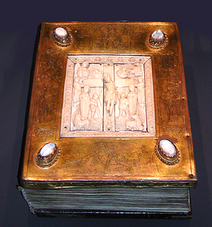 Der Buchdeckel zeigt ein Walrosszahnrelief der Kreuzigung, umgeben von einem Rahmen aus vergoldetem, graviertem Kupferblech.